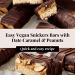 Delicious homemade Vegan Snickers Bars featuring a date caramel layer, almond flour nougat crust, roasted peanuts, and a rich dark chocolate coating. This recipe uses simple plant-based ingredients and requires no baking, making it perfect for a quick, healthy, and satisfying treat.