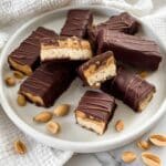 Delicious homemade Vegan Snickers Bars featuring a date caramel layer, almond flour nougat crust, roasted peanuts, and a rich dark chocolate coating. This recipe uses simple plant-based ingredients and requires no baking, making it perfect for a quick, healthy, and satisfying treat.