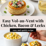 Vol-au-vent is a classic French pastry that makes for an elegant appetizer or light meal. This version is filled with a savory mixture of chicken, crispy bacon, and tender leeks, all nestled inside golden, buttery puff pastry shells.